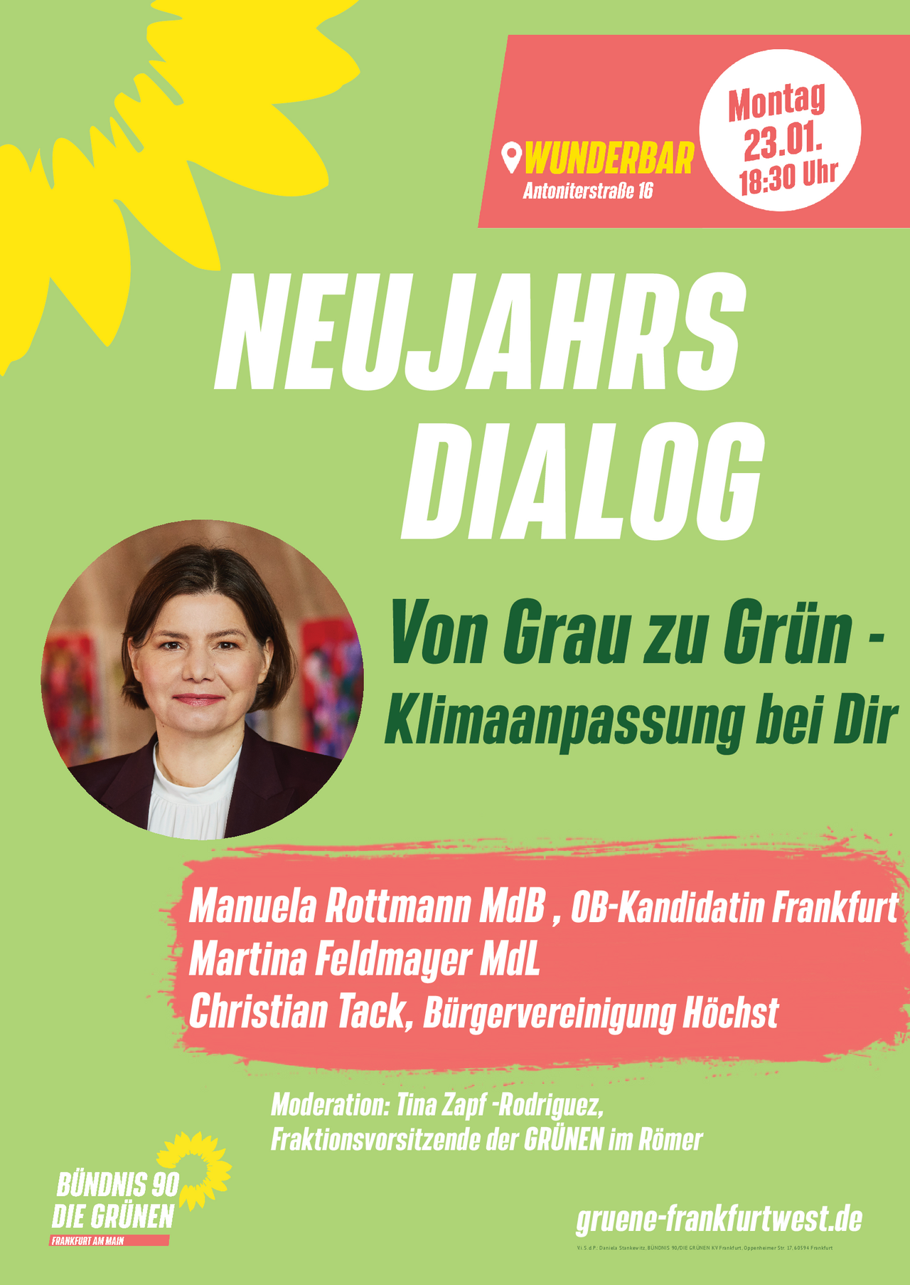 Mit dieser Frage laden die Grünen im Frankfurter Westen zu ihrem traditionellen Neujahrsdialog ein. Auch in diesem Jahr findet dieser in der Wunderbar in Frankfurt Höchst, Antoniterstraße 16 statt. Die Veranstaltung beginnt am 5. Februar 2024 um 19 Uhr, Einlass ab 18:30 Uhr.